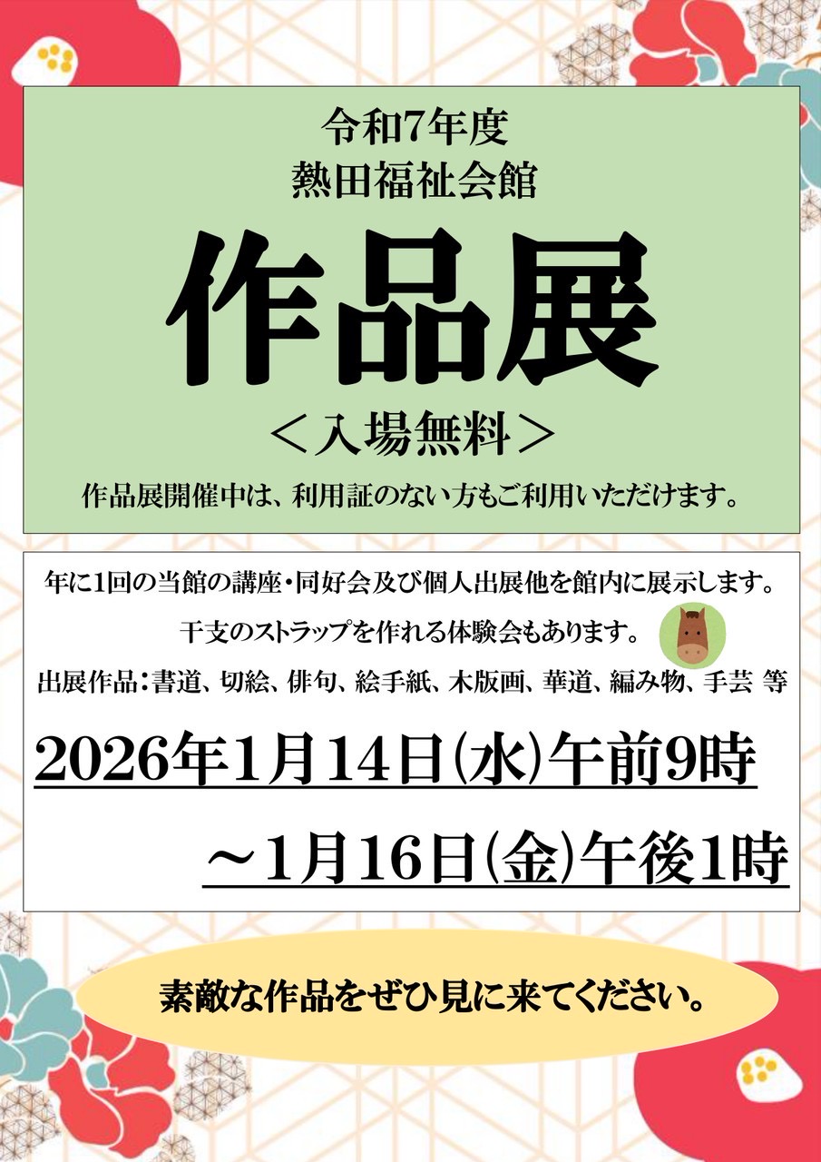 令和8年1月14日から16日まで、熱田福祉会館を利用する団体が参加する、「令和7年度熱田福祉会館作品展」が開催されました。当会館を会報誌「花しょうぶ」の編集会議に利用させていただいている関係から、今年も創刊号から最新号(第49号)までのすべての「花しょうぶ」を展示するとともに、名古屋市高年大学の募集要項、鯱城学園紹介パンフレットなども展示して広報活動に努めました。特に今回は、過去に掲載した記事のうち、郷土の名所や熱田神宮境内の施設、堀川に関する紹介記事をコピーして提供しました。