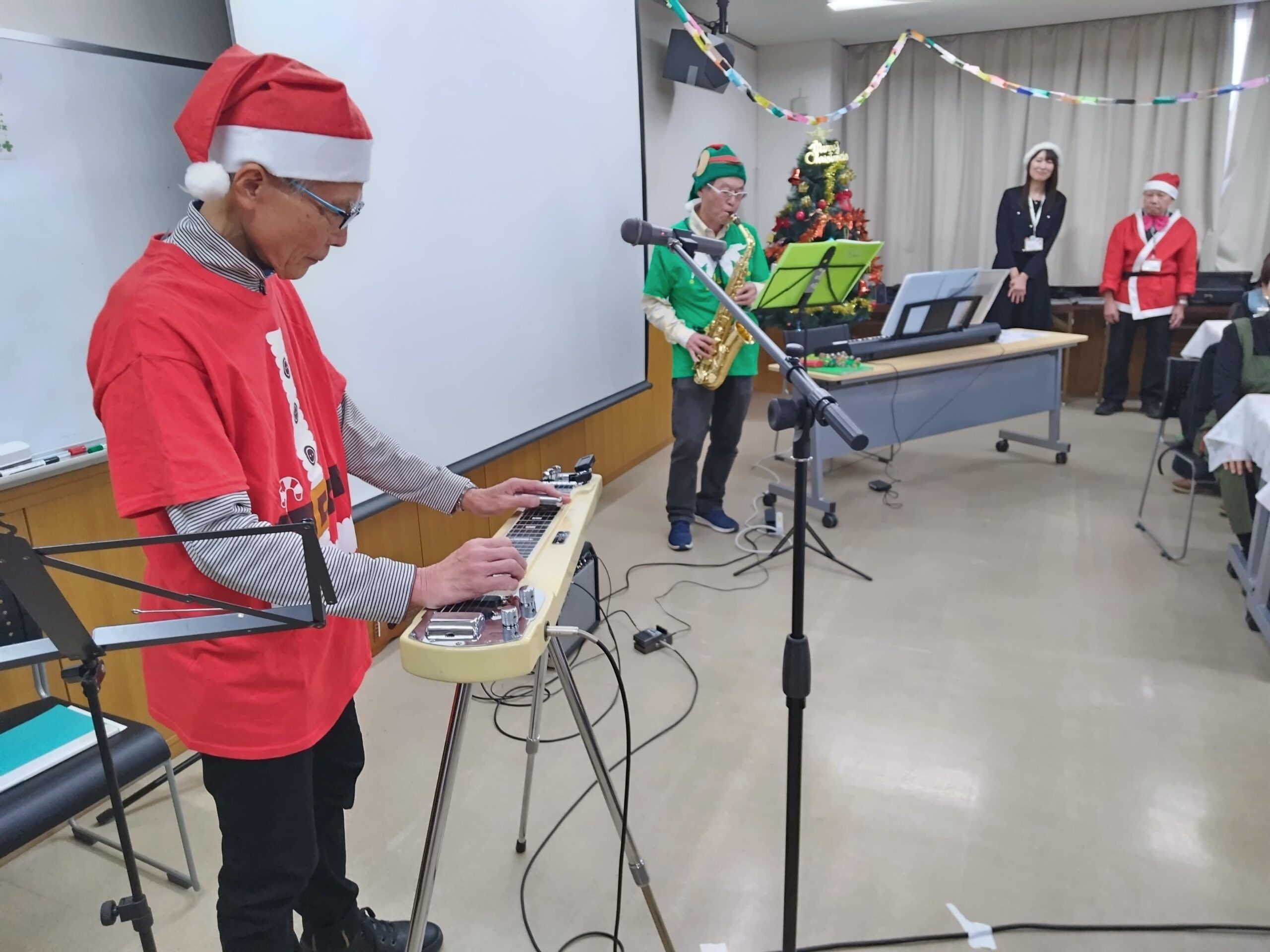 次に、薗田氏のサックス演奏と吉本さん(千種区社会福祉協議会職員)のピアノとの合同演奏で「サンタが街にやってきた」と「ラストクリスマス」の2曲を演奏して頂きました。