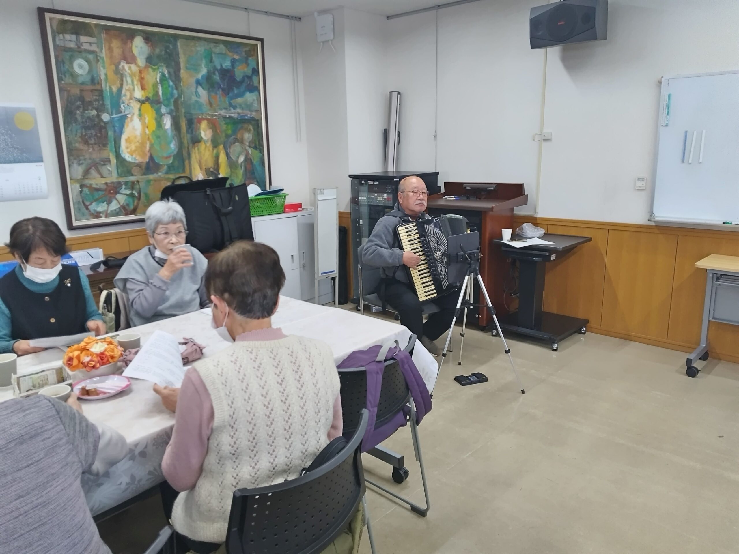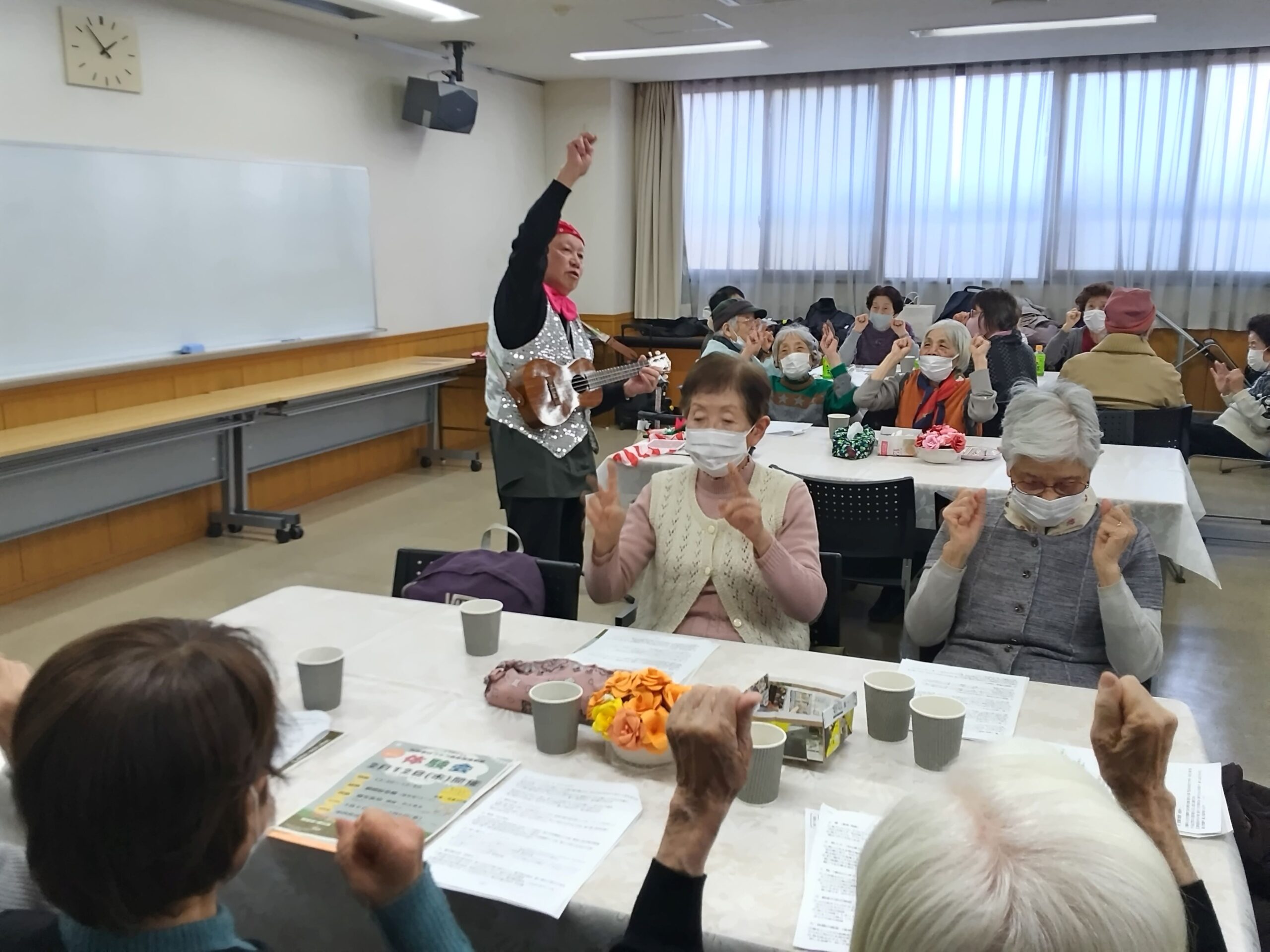 長谷川氏の「アコディオン」による演奏は、ご高齢者には思い起こせる懐かしいメロデイーを選曲して合唱して頂き「銀座の恋の物語」や「故郷の廃家」「アンパンマンマーチ」「銀色の道」「旅愁」「雪の降る街」「ガードの下の靴磨き」「湖畔の子宿」等々多彩にわたる懐かしいメロディーの演出となり、大きな声での合唱を頂きました。内にはマイクをお渡しますと、演奏曲より先に唄い始める方もおりましたが、唄う音程はともかくと致しましても、大きな声を出して唄うということは高齢者にとりましても健康の増進にもあたり、誠に良い事ではなかろうかと思っています。