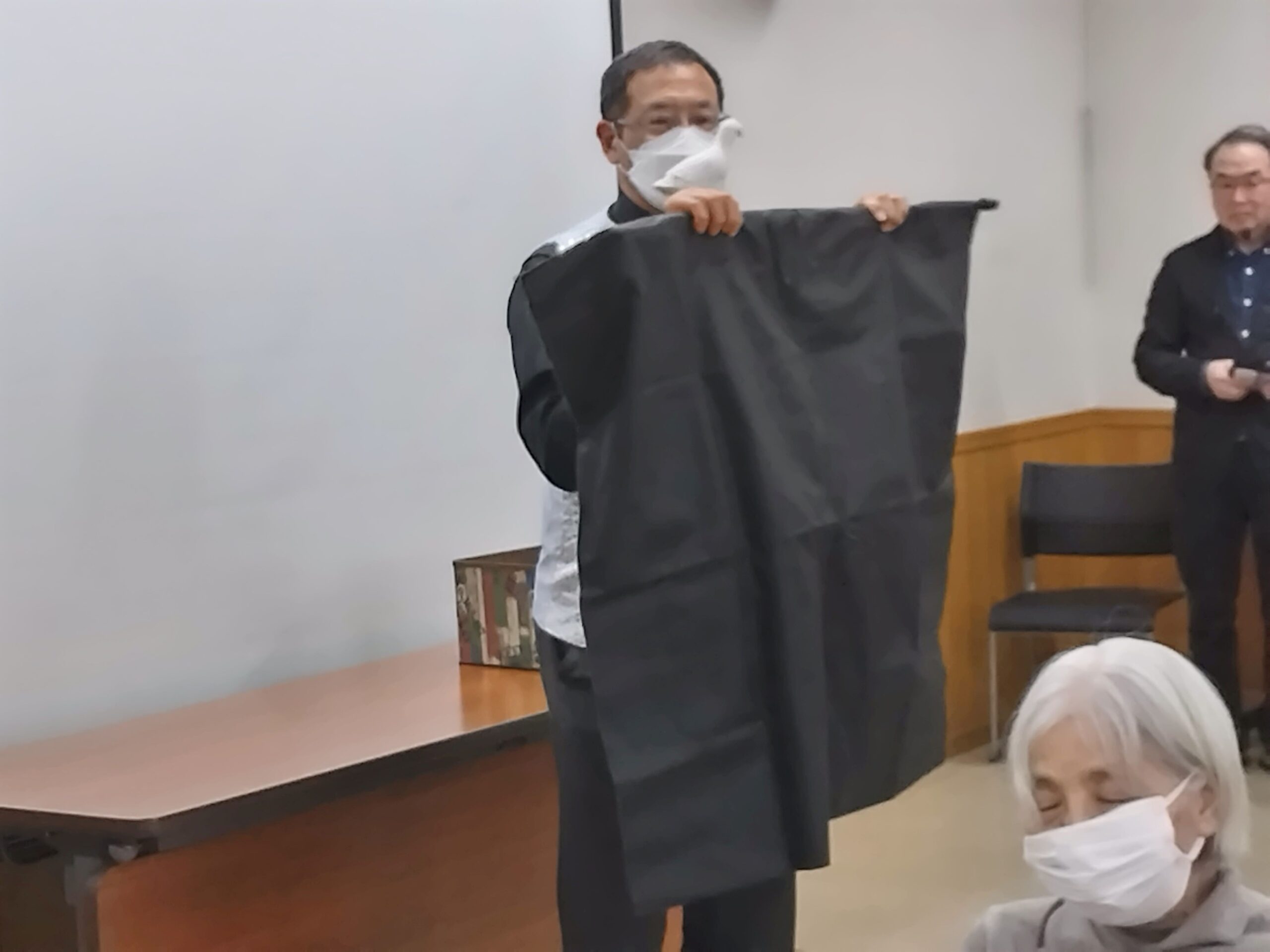 次いで、代表の伊勢氏は、身体全体を隠すほどの大風呂敷を両手の指で持ち、頭からすっぽりと隠し、すぐ頭を持ち上げると、何とハトの形の物がおでこに着けて披露したではないか、その他2件程同じような方法で皆さんにご披露されました。私の独断と偏見ではどうやな布の持った右手小指5本が本物では無いのではないかと推察したのですが、如何かな?
