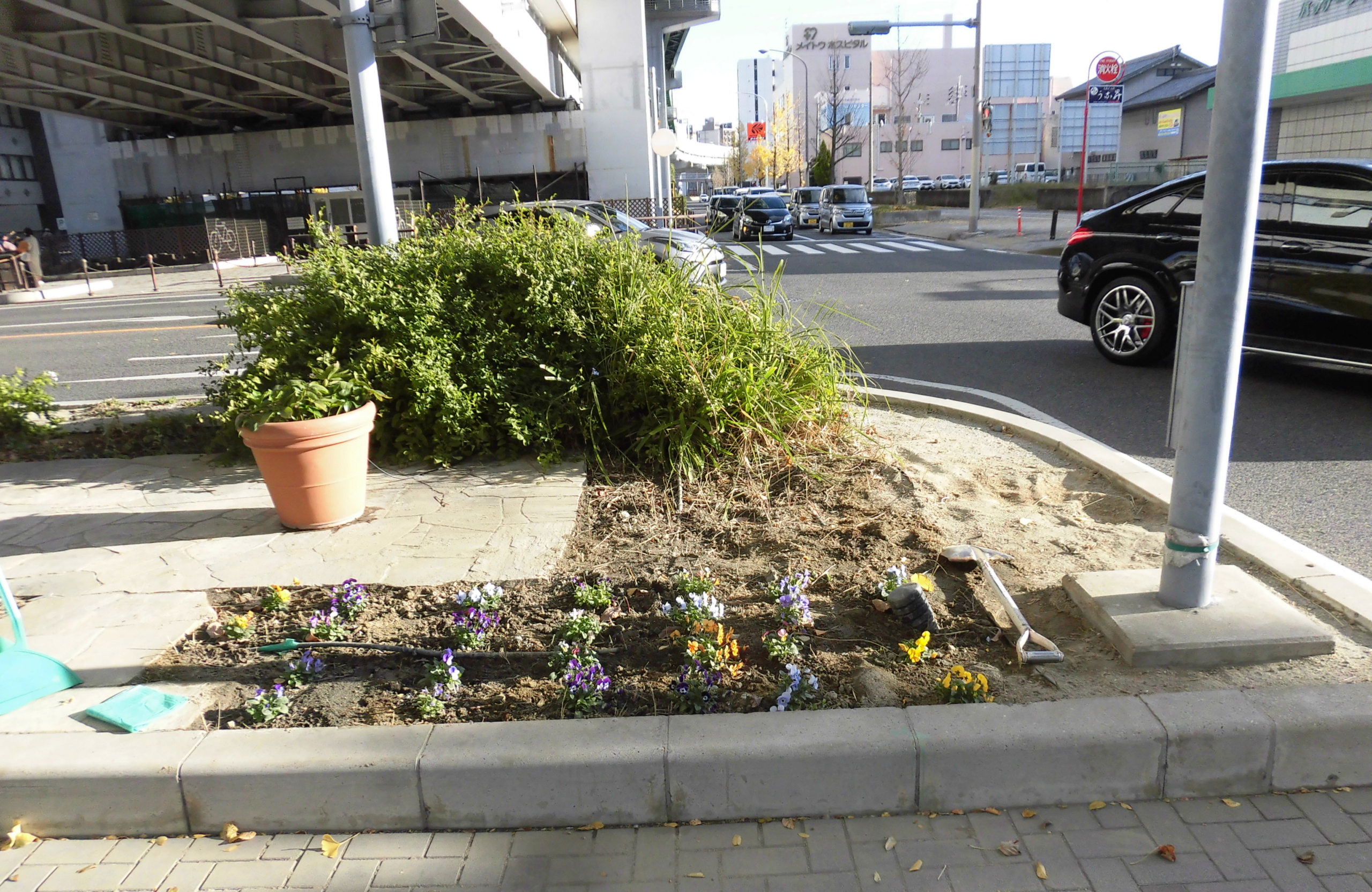 本日、定期整備作業を行いました。特に公園東側歩道沿いの花壇は、来春に面積を拡大するため、周辺の雑草を刈り取りました。 (写真をご参照ください) 作業中には、若いお母さんが7か月の赤ちゃんをベビーカーで押しながら通りかかられ、偶然お話をする機会がありました。幼稚園児のお兄ちゃんがいるそうで、このお兄ちゃんは花が大好きとのこと。毎日、園への行き帰りの際に植えられている花や樹木を見るのを楽しみにしているそうです。 こうしたお話を伺うと、私たちもボランティア活動のやりがいを大いに感じます。