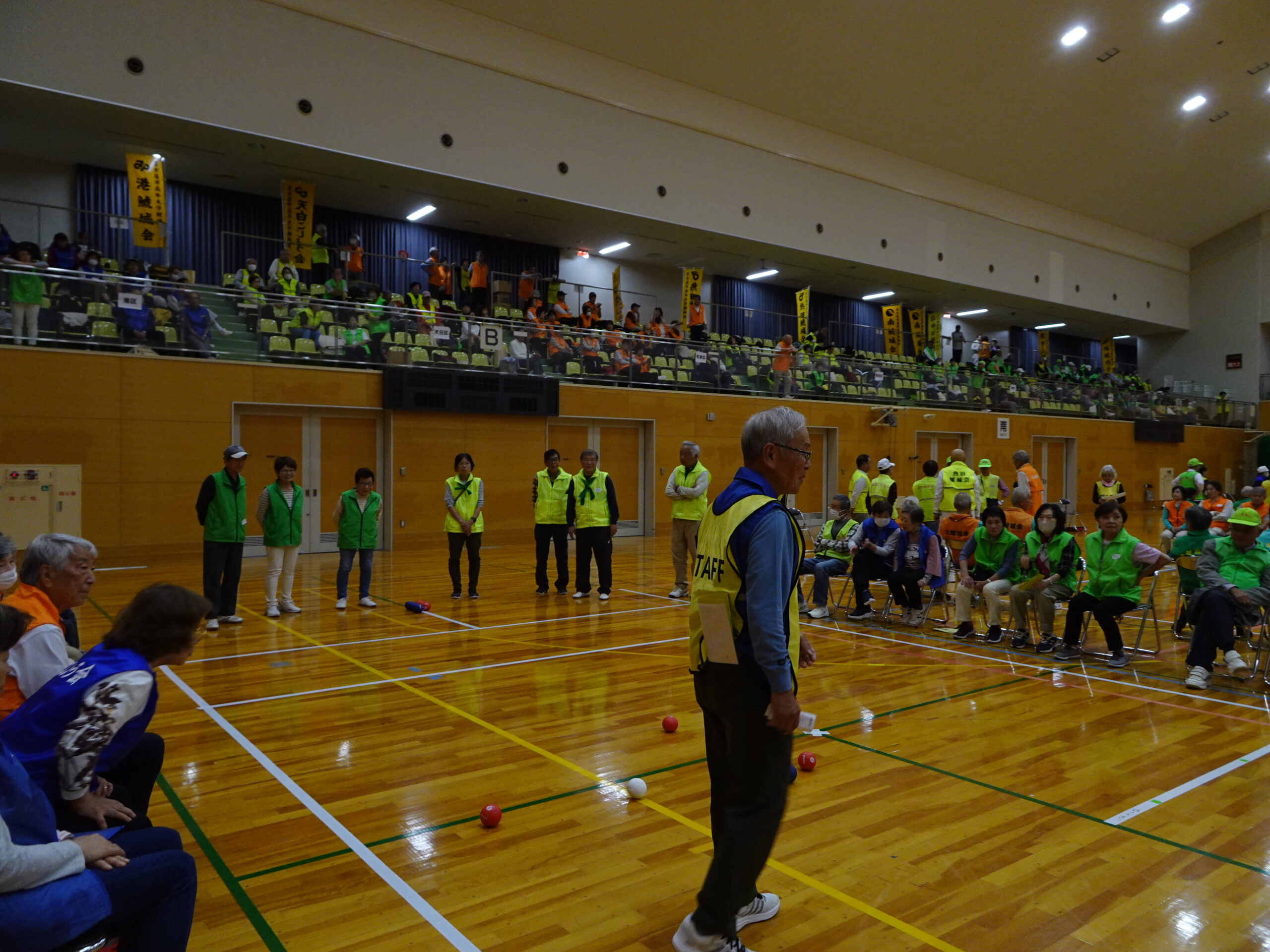 競技は、鯱城学園時代の体育祭を思い出す内容でしたが、全員での〇×クイズは作戦負け、選抜選手でのボッチャは3位と健闘、龍の玉送り、玉入れは残念な結果でしたが、参加者全員が熱気あふれ、普段眠っている体を動かして、競技に一生懸命でした。お昼の応援タイムでは、古橋応援団長の指揮のもと、全員でみどり節を叫び、一致団結を示しました。競技が終わり、多くの参加者での民謡踊りを経て閉会式となりました。