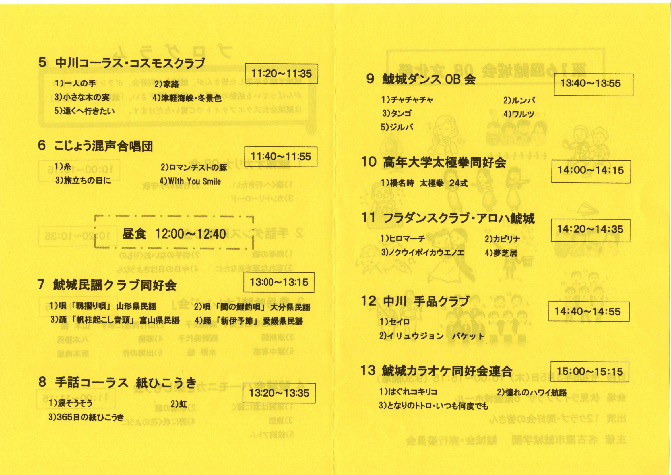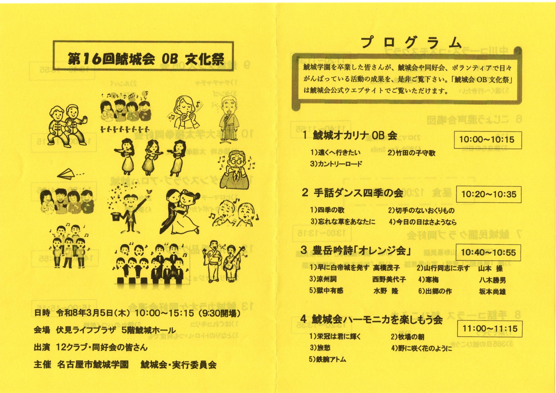 緑鯱城会会員の皆さん 第16回鯱城会OB文化祭が下記開催されますのでご案内申し上げます。 日時 : 令和8年3月5日(木) 10:00~15:15 会場 : 鯱城学園5階ホール 出演 : 12クラブ・同好会の皆さん 緑鯱城会同好会として参加は有りませんが、上記出演の個々の団体に所属する会員が出演しますので、どうぞ会場へ足を運び下さい。 *)当日の各団体の出演プログラムを見て下さい。