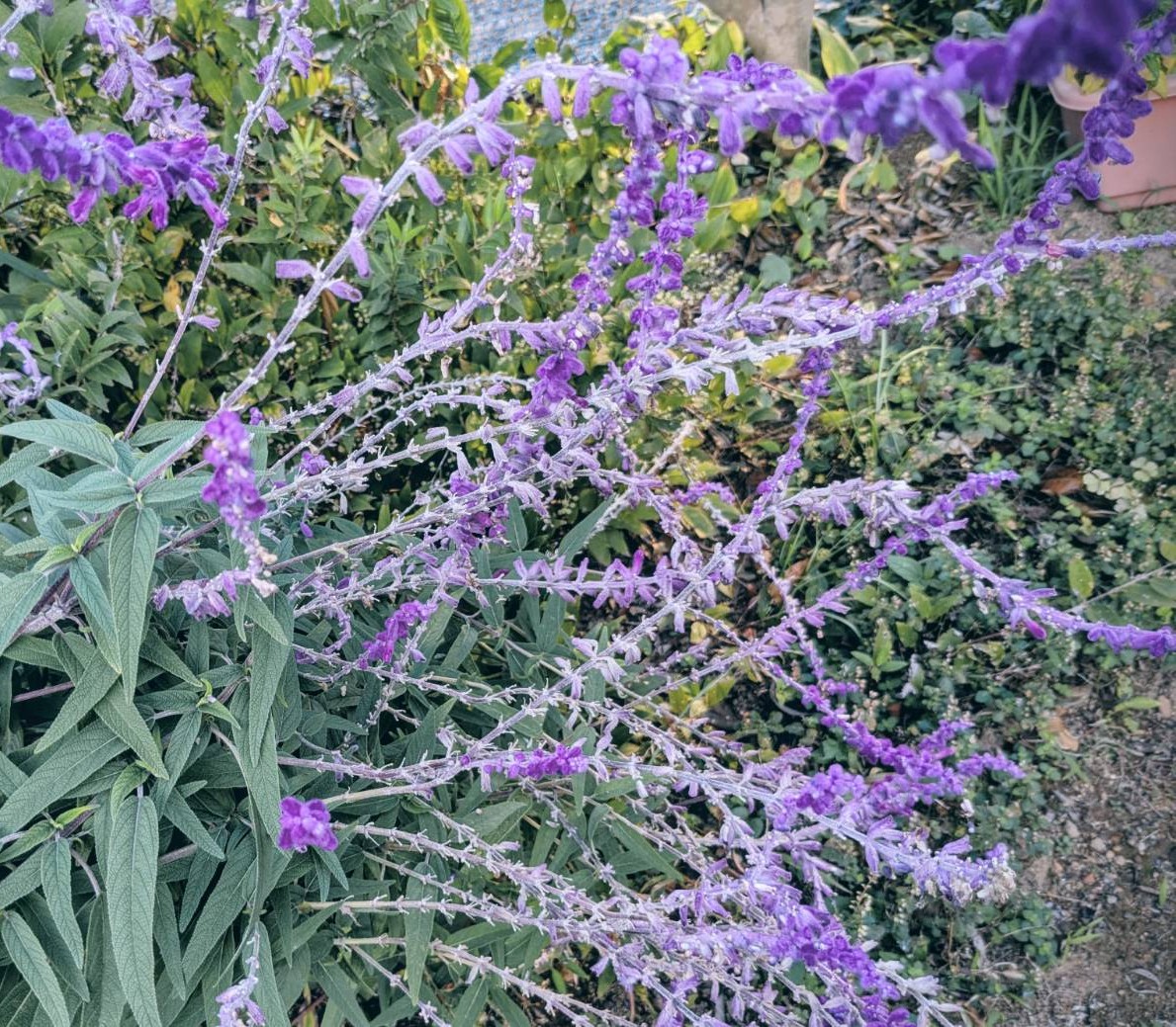 地蔵川遊歩道ではご婦人の指先に留まる赤とんぼに出合い、金木犀の花の蕾を見て秋を感じました。また、民家の庭先のアメジストセージの花をスマホ植物図鑑で検索されたご婦人もみえました。