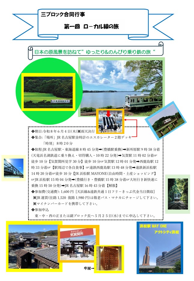 三ブロック合同企画行事2026・第1回6月4日のご案内「ロ-カル線”天竜浜名湖鉄道”乗り鉄の旅」