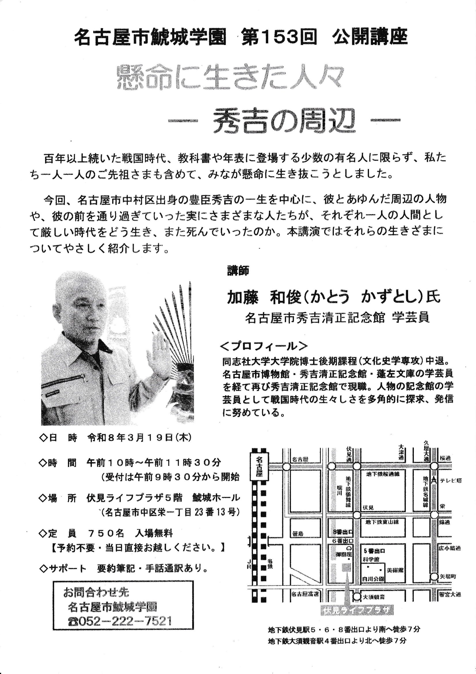 3月19日 鯱城学園鯱城ホールにて第153回公開講座が開催されます。
